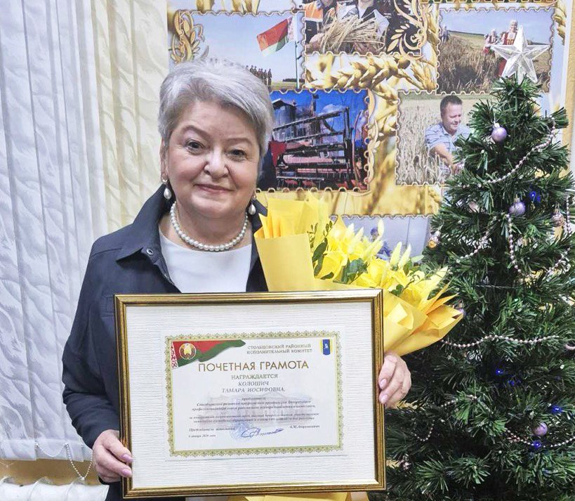 В торжественной обстановке председатель Столбцовского районного исполнительного комитета Андрей Атрушкевич вручил Почетную грамоту председателю Столбцовской районной профсоюзной организации Белорусского профессионального союза работников агропромышленного комплекса Тамаре Колошич.