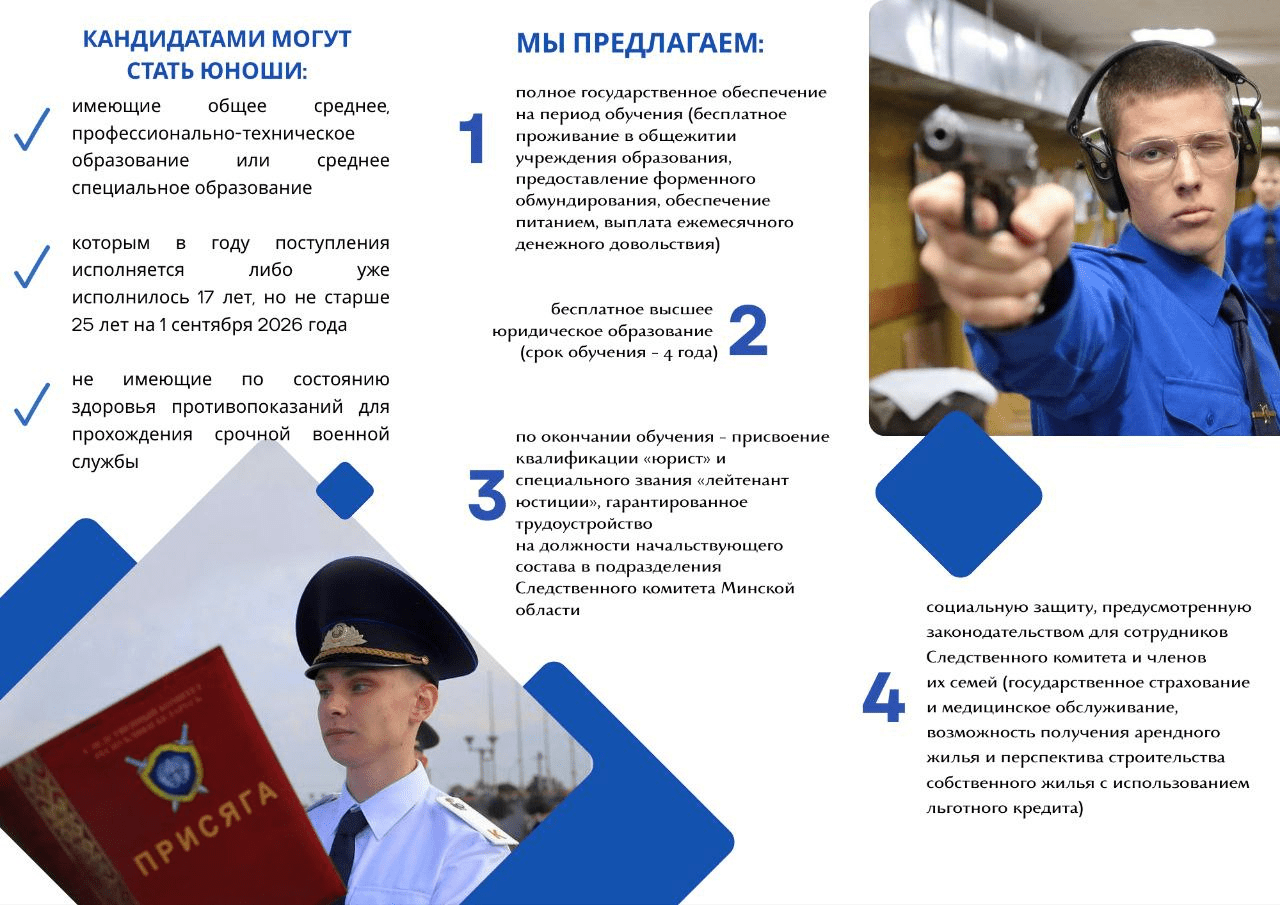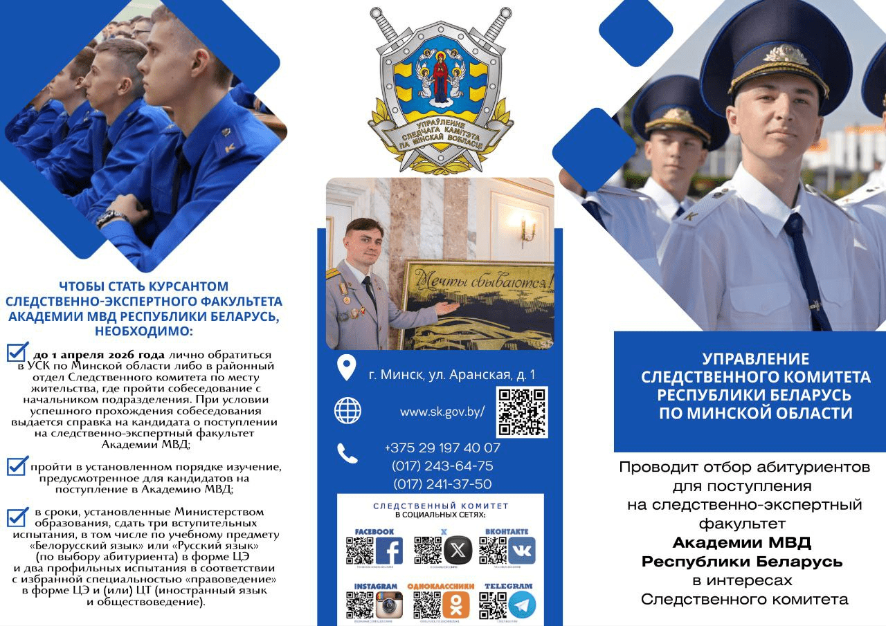Управление Следственного комитета Республики Беларусь по Минской области осуществляет отбор кандидатов для поступления в 2026 году на следственно-экспертный факультет учреждения образования «Академия Министерства внутренних дел Республики Беларусь» с целью обучения в интересах Следственного комитета.
