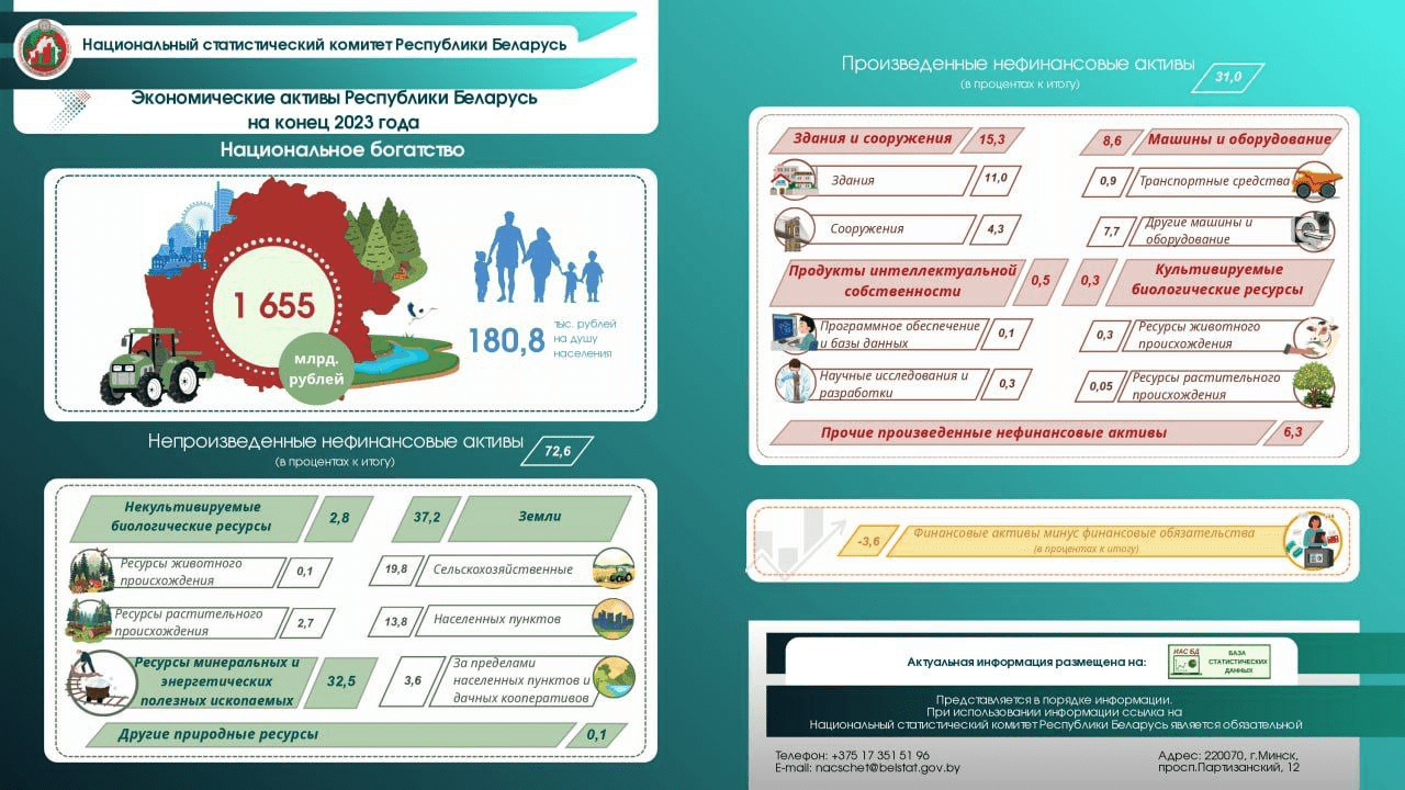 Национальным статистическим комитетом разработана система оценки национального богатства. На конец 2023 года национальное богатство Республики Беларусь составило 1 655 млрд. рублей.