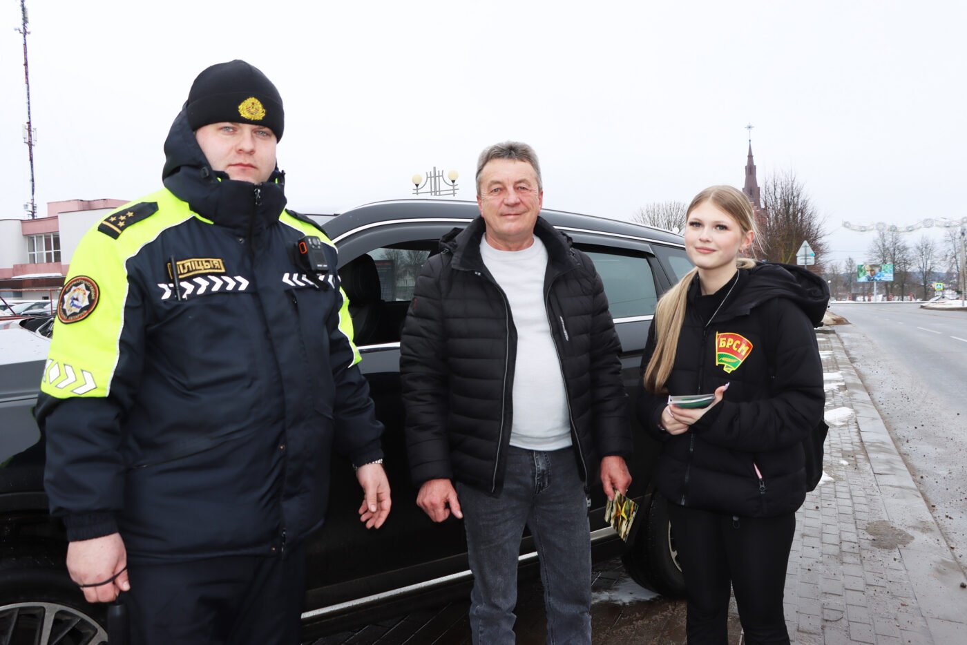 На ул. Центральной в Столбцах поздравили водителей-мужчин члены волонтерского отряда «Доброе сердце» из средней школы № 3 г. Столбцы Варя Тарасова и Милана Митякина, а также инспекторы ДПС отдела ГАИ Столбцовского РОВД Дмитрий Кудревич и Сергей Болсун.