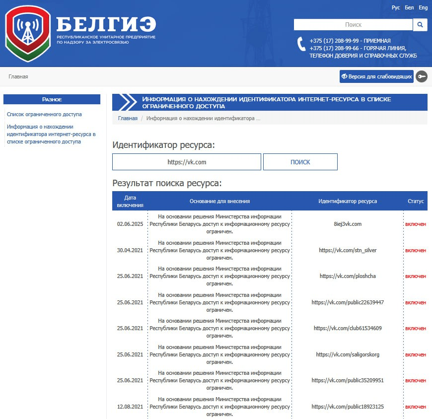Сайта vk.com больше нет в списке заблокированных ресурсов на сайте БелГИЭ (государственной инспекции по электросвязи). Об этом сообщает БЕЛТА.
