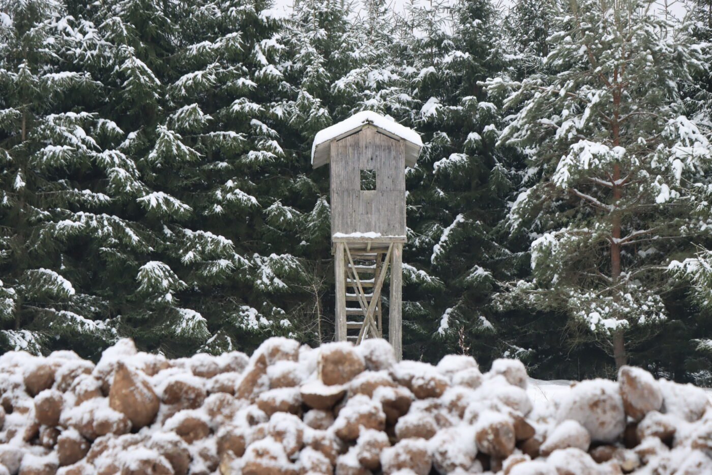 Оглядываюсь на площадке. Здесь все хорошо продумано: есть кормушка, смотровая вышка, солонец. По следам на снегу понятно, что звери здесь частые гости.