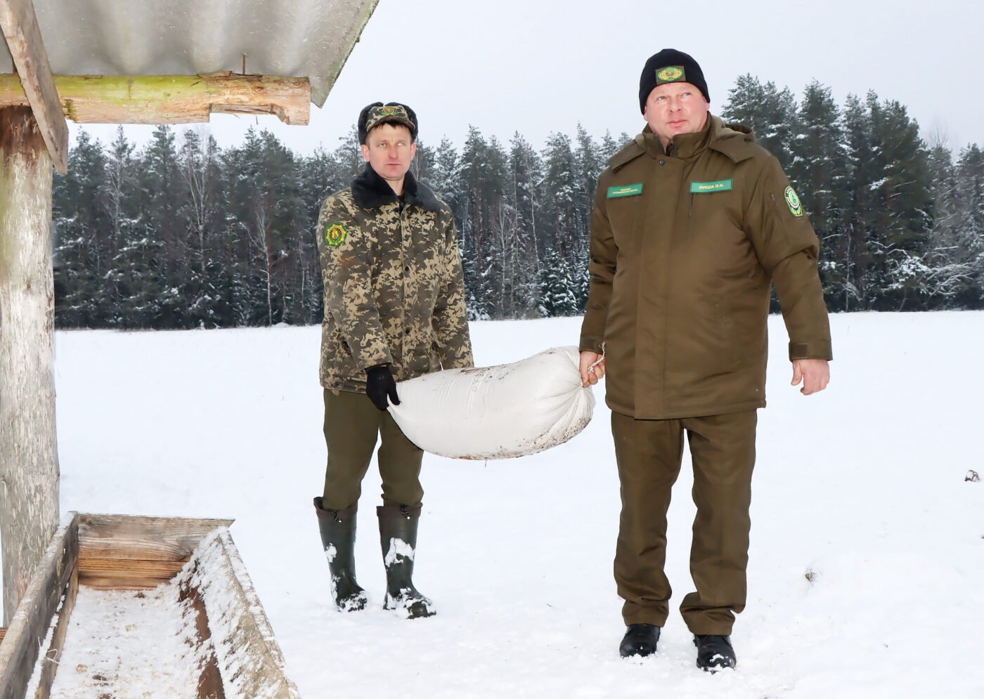 Олег Лукша и Роман Беть достают мешки с зерном. Они распределяют корм, проверяют состояние площадки, осматривают следы. Затем Олег Николаевич выкладывает белесый «кирпич» – спрессованную соль. Частично звери ее слижут, остальное уйдет в почву со снегом, но ничего не пропадет впустую.