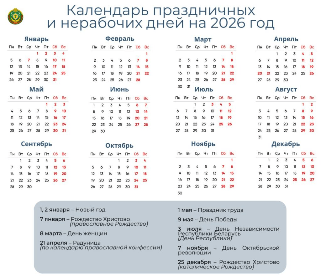 Как белорусы будут работать и отдыхать в 2026 году, рассказали в Министерстве труда и социальной защиты Республики Беларусь.