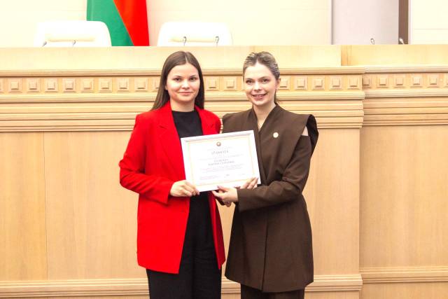 За весомый личный вклад, всестороннюю поддержку инициатив и проектов Молодежного совета при Совете Республики Национального собрания Республики Беларусь ей была вручена почетная грамота Председателя Молодежного совета Алины Ретьковой — символично, что признание пришло из рук коллеги, разделяющего те же ценности и цели.