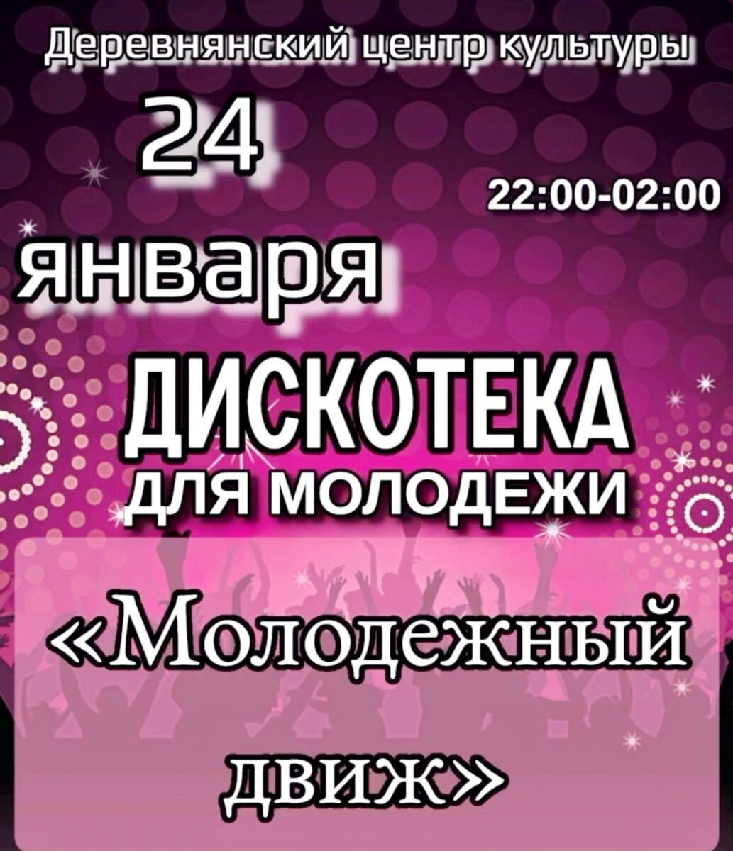 24 января Деревнянский центр культуры станет эпицентром энергии, музыки и хорошего настроения. С 22.00 и до 02.00 для молодежи состоится дискотека под названием «Молодежный движ».