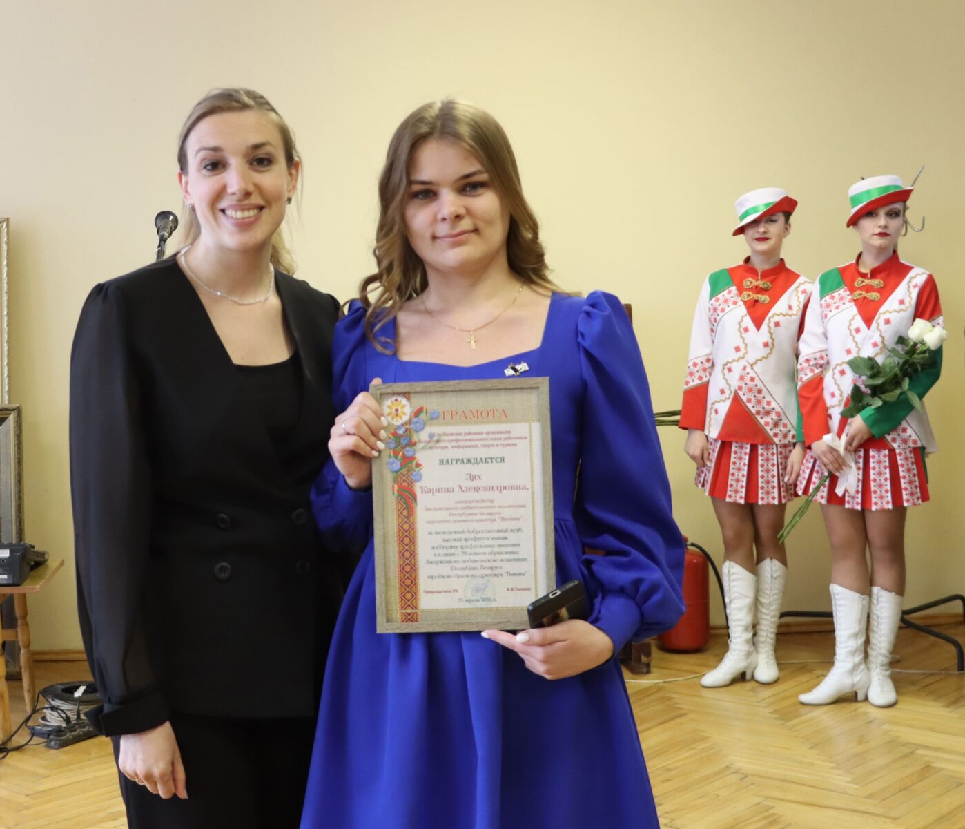 Татьяна Вячеславовна вручила Карине Лях грамоту от Столбцовской районной организации Белорусского профессионального союза работников культуры, информации, спорта и туризма.