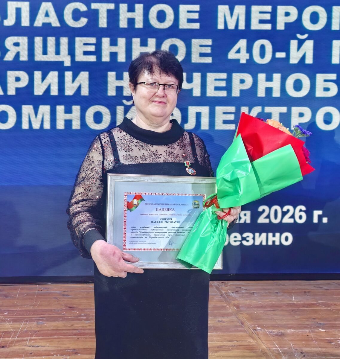 На областном мероприятии, посвященном 40-й годовщине аварии на Чернобыльской АЭС, врач клинической лабораторной диагностики Столбцовской райбольницы Наталия Юнцевич удостоена награды