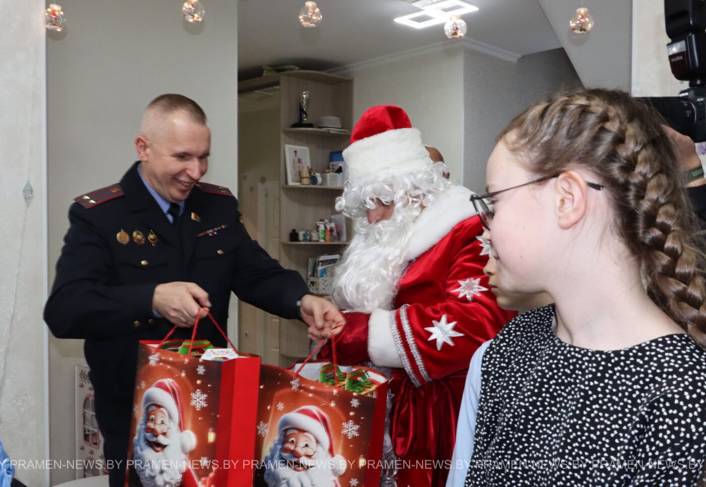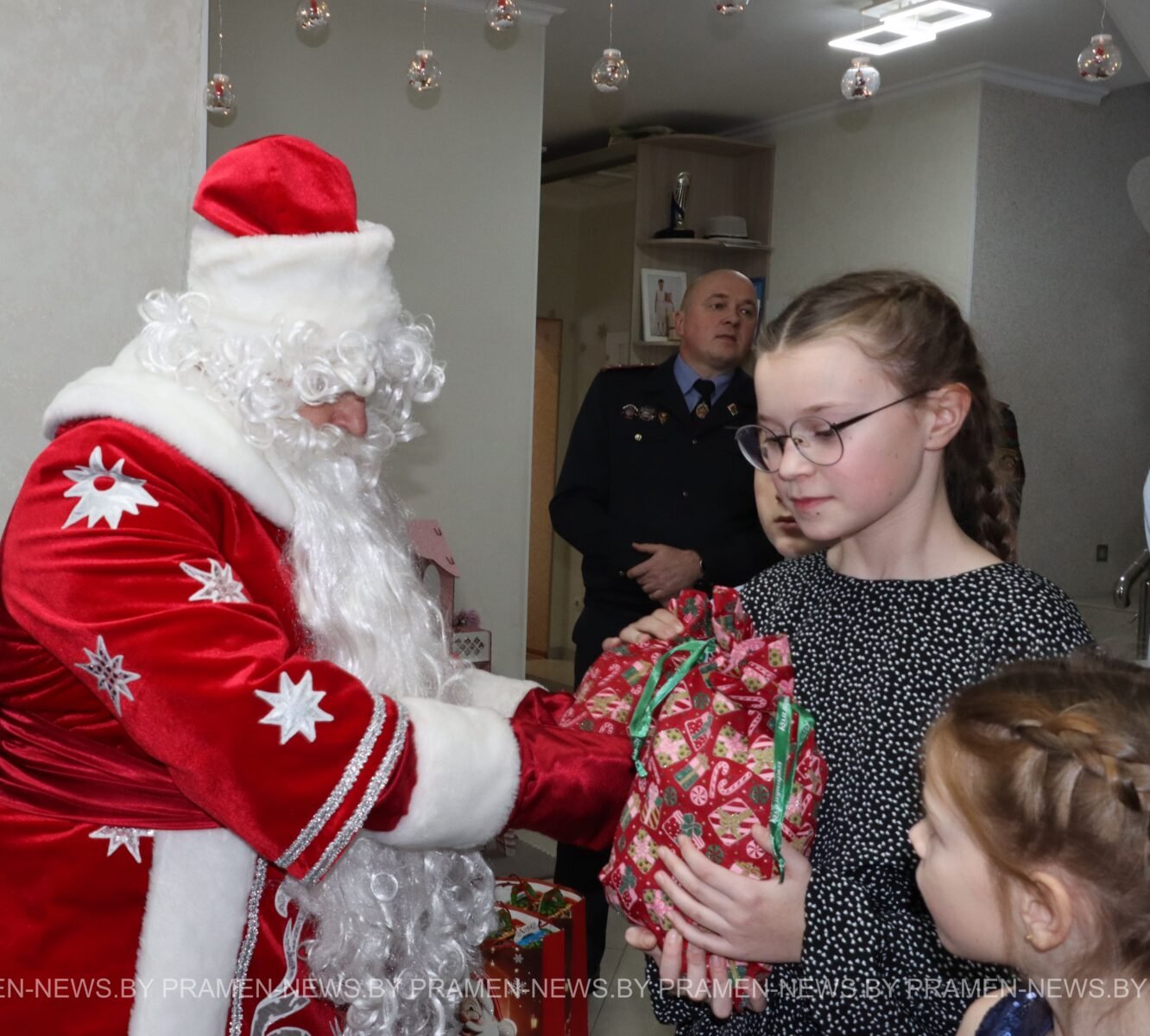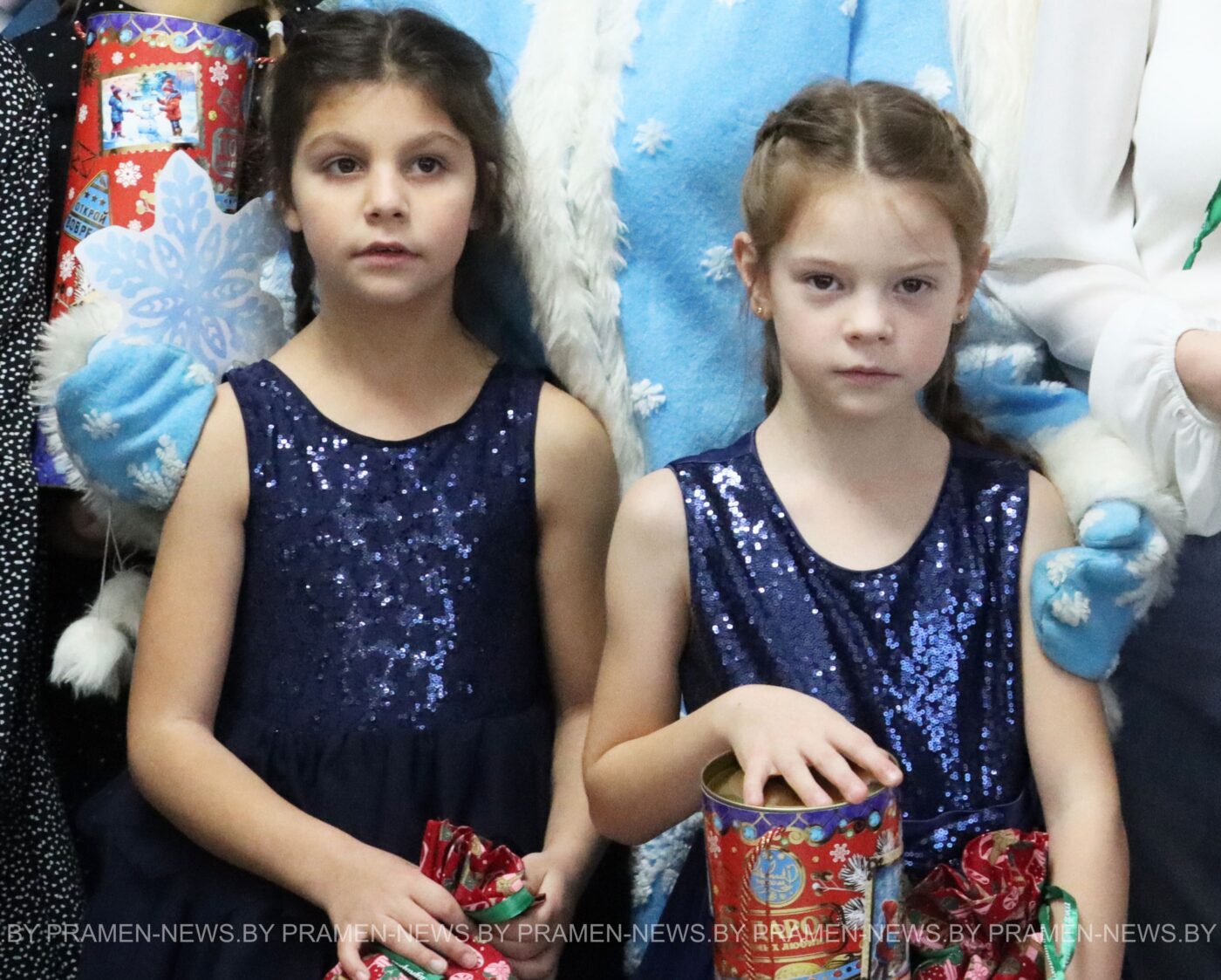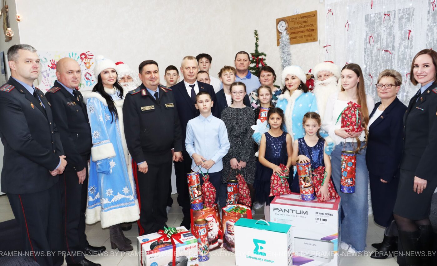 Не один, а сразу два Деда Мороза — с пушистыми бородами и добрыми улыбками — и две Снегурочки в серебристых нарядах. А вместе с ними — целая делегация добрых гостей: председатель Столбцовского райисполкома Андрей Атрушкевич, начальник УВД Миноблисполкома Андрей Любимов, начальник управления по образованию, спорту и туризму райисполкома Людмила Стонько, начальник районного отдела милиции Александр Новицкий.