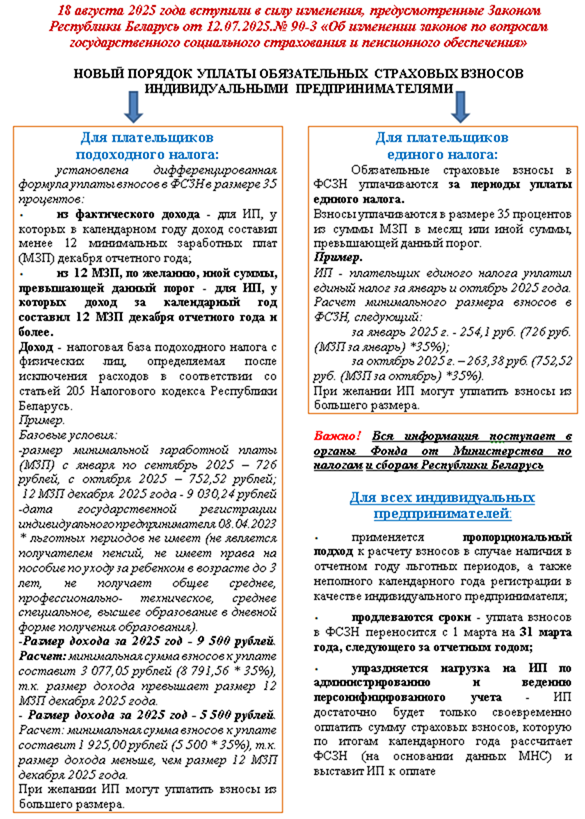 С 18 августа 2025 года в Беларуси уже действует новый порядок уплаты обязательных страховых взносов для индивидуальных предпринимателей. Изменения касаются расчета взносов для плательщиков подоходного налога, сроков уплаты и снятия с ИП обязанности вести персонифицированный учет.