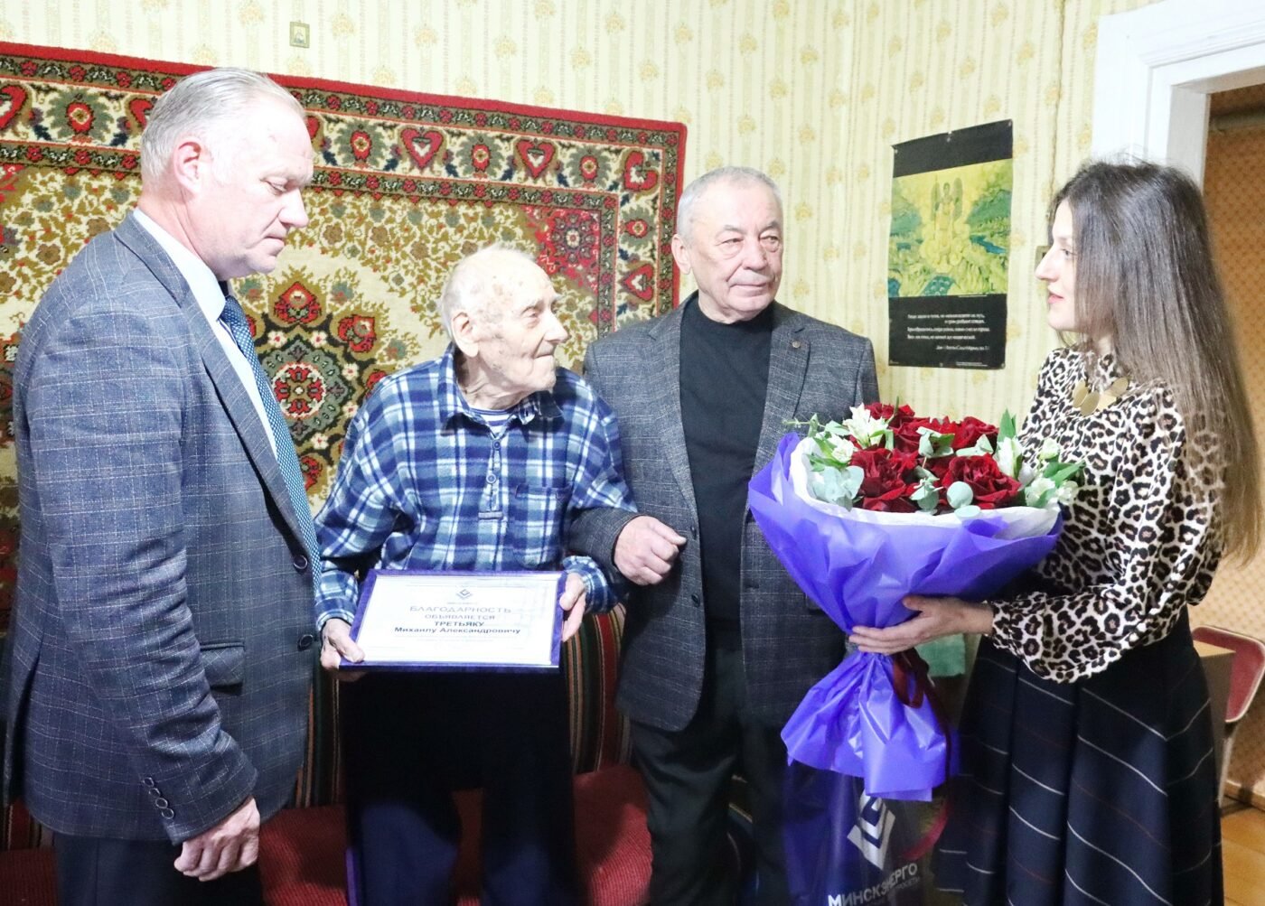 Гости поблагодарили Михаила Александровича за многолетний добросовестный труд, активную жизненную позицию, пожелали дальнейшего активного долголетия и вручили Благодарность РУП «Минскэнерго» за весомый личный вклад в развитие Минской энергосистемы и в связи с 95-летием со дня рождения, цветы и подарки.