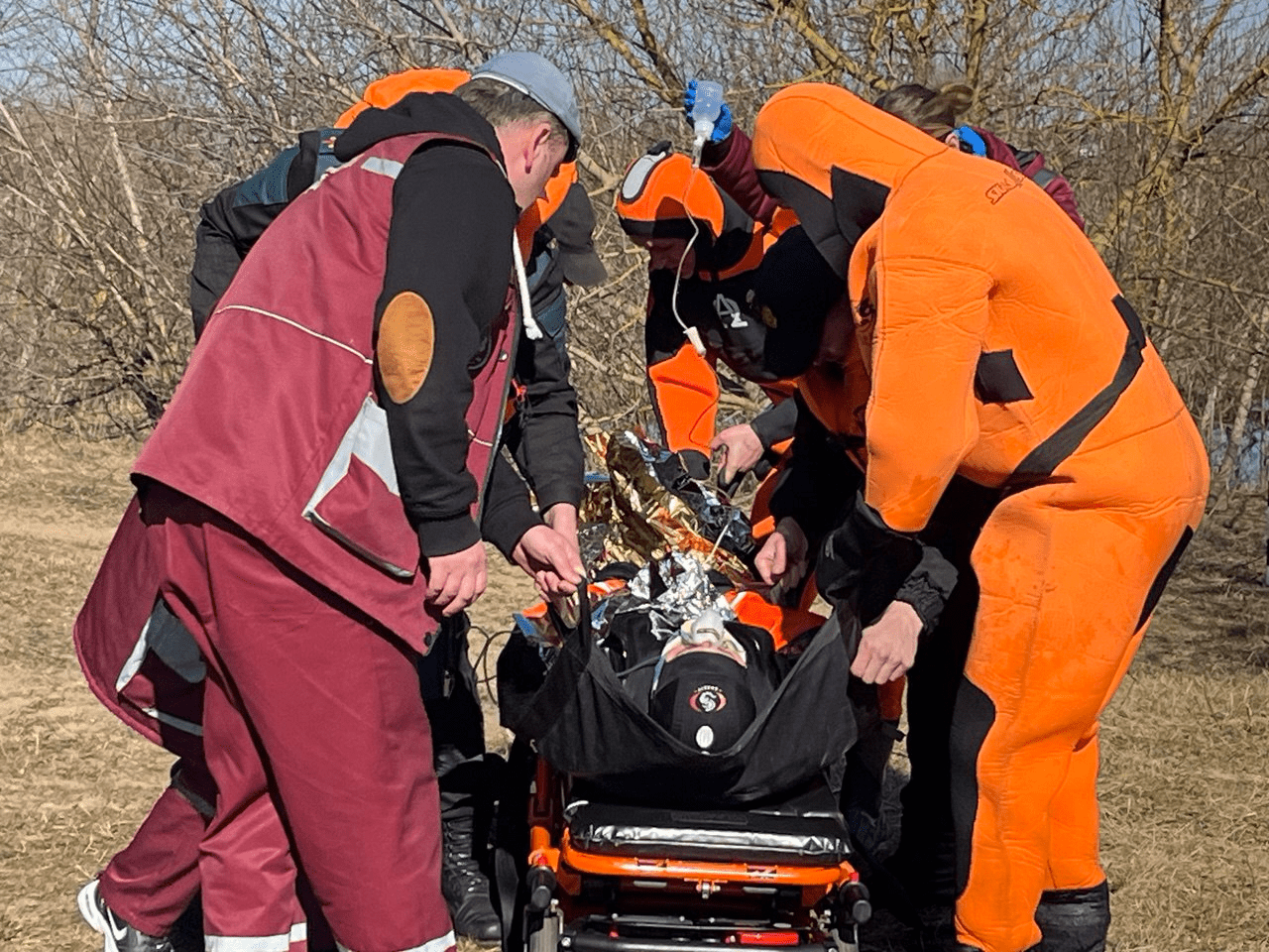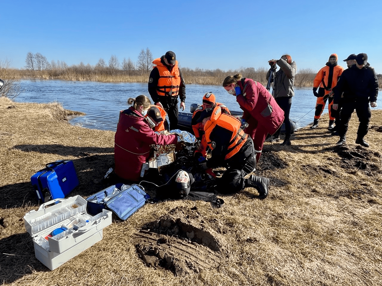 Используя специальные средства — спасательные круги, верёвки, лодку, спасатели успешно «доставили» пострадавшего на берег и передали медикам для осмотра.