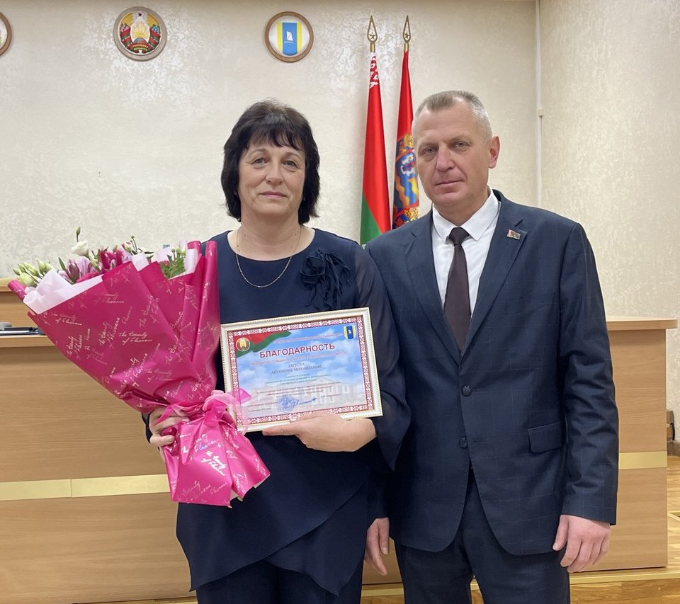 Председатель районного исполнительного комитета Андрей Атрушкевич вручил благодарность главному бухгалтеру управления по сельскому хозяйству и продовольствию райисполкома Антонине Загуста и поздравил её с днём рождения.