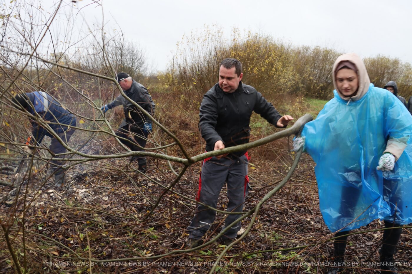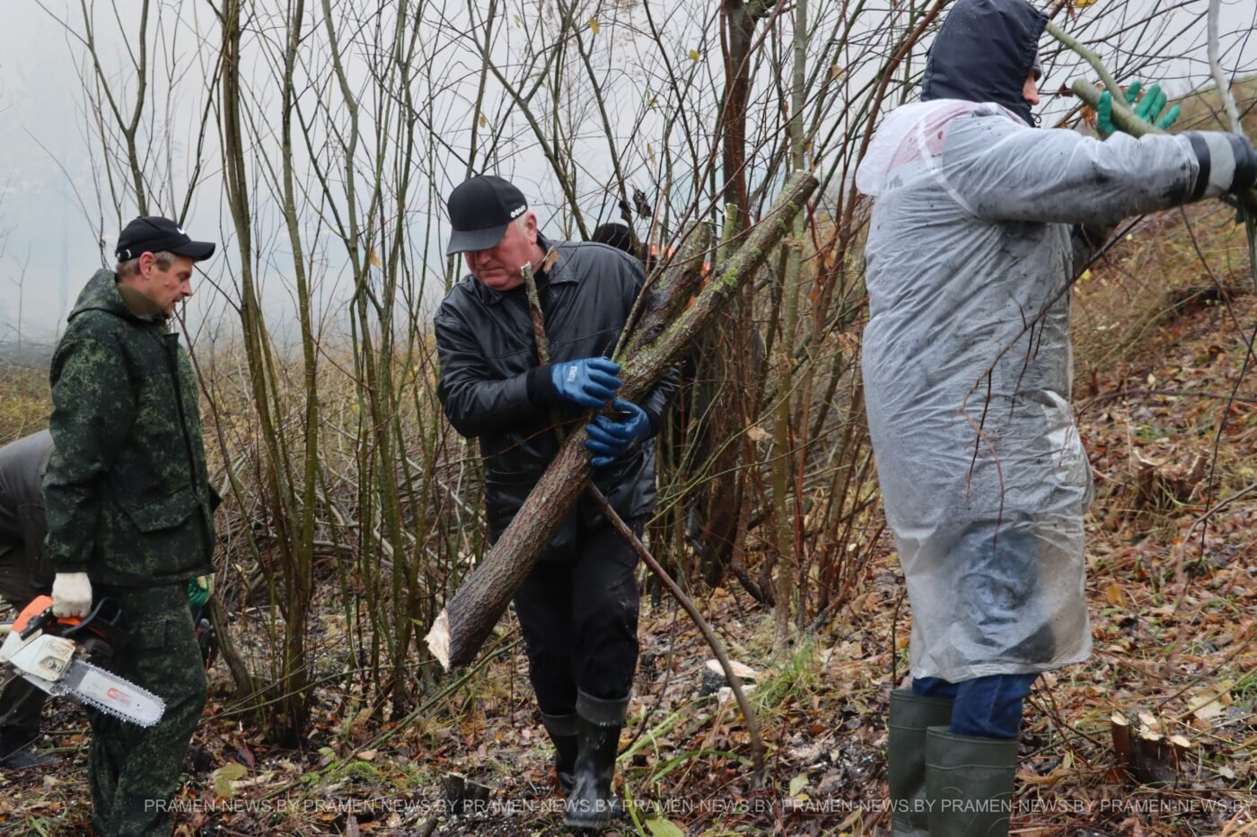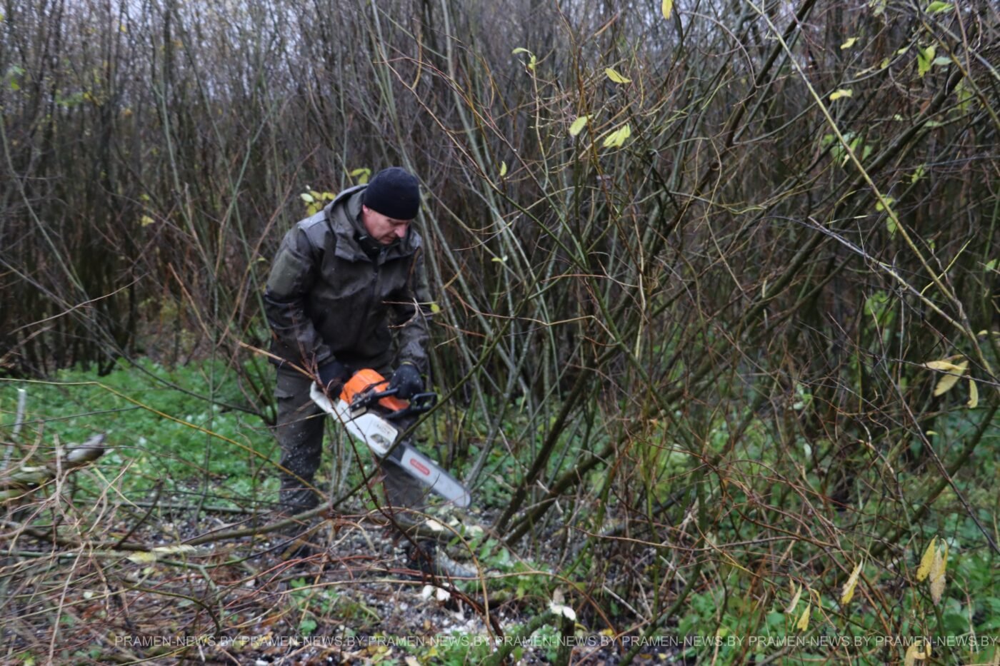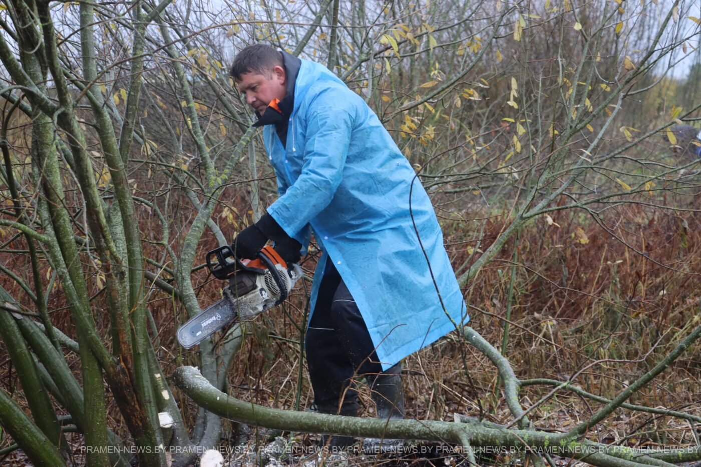 Представители райисполкома наводят порядок на въезде в город вдоль улицы Танкистов вместе с председателем райисполкома Андреем Атрушкевичем.
