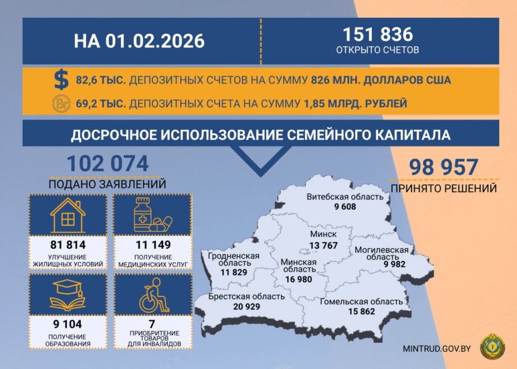 Программа «Семейный капитал» работает в Беларуси уже не первый год, и цифры в статистике продолжают расти, информирует Минтруда и соцзащиты. На 1 февраля открыто 151 836 депозитных счетов – это десятки тысяч семей, которые получили реальную поддержку от государства.