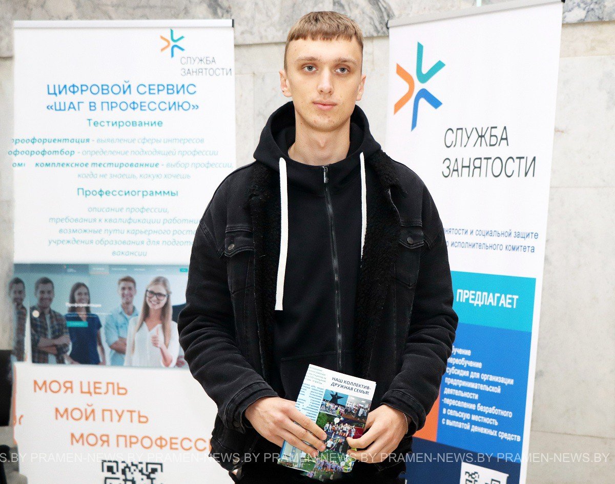 Ярмарку вакансий посетили не только граждане «серебряного» и предпенсионного возраста, но и молодые люди. Среди них — Андрей Жигалкович из Столбцов. Он сейчас учится заочно в БГАТУ на инженера агропромышленного комплекса и находится в поиске работы.