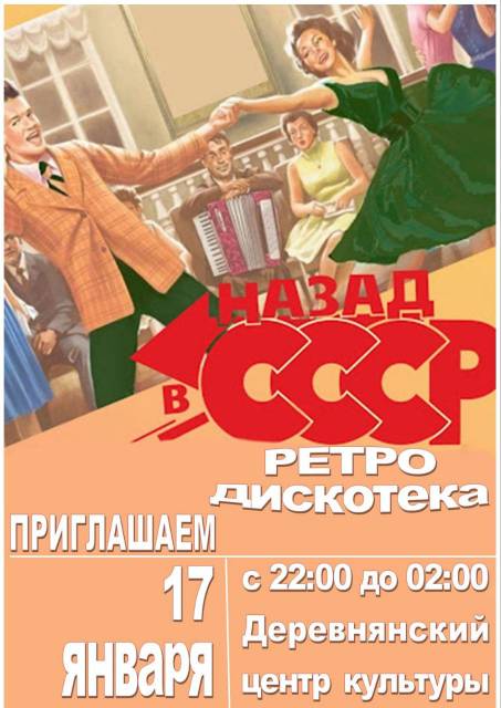 17 января в стенах Деревнянского центра культуры гостей ждет настоящее путешествие во времени: состоится яркая и зажигательная ретро-дискотека «Назад в СССР»!