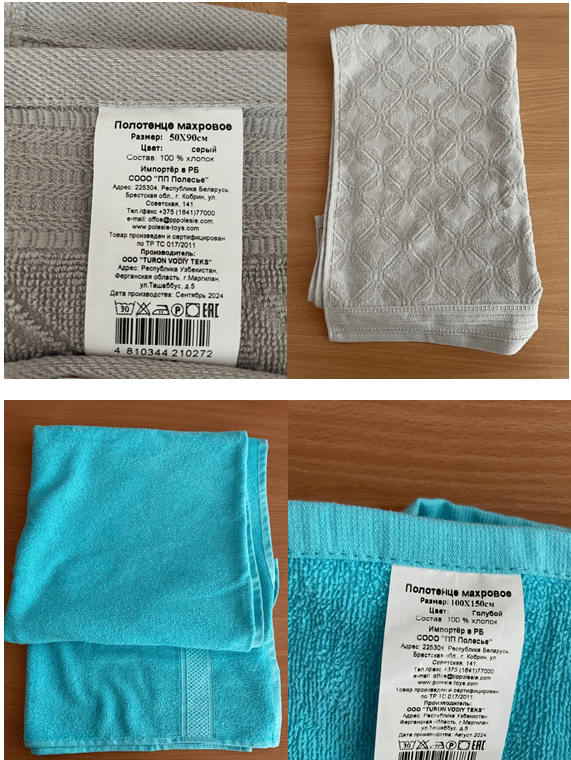 В ходе проведения проверки отделом государственного надзора за техническими регламентами и стандартами и государственного метрологического надзора (г. Молодечно) Инспекции Госстандарта по Минской области и г. Минску были выявлены полотенца махровые, не соответствующие требованиям технического регламента Таможенного союза «О безопасности продукции легкой промышленности» (ТР ТС 017/2011).