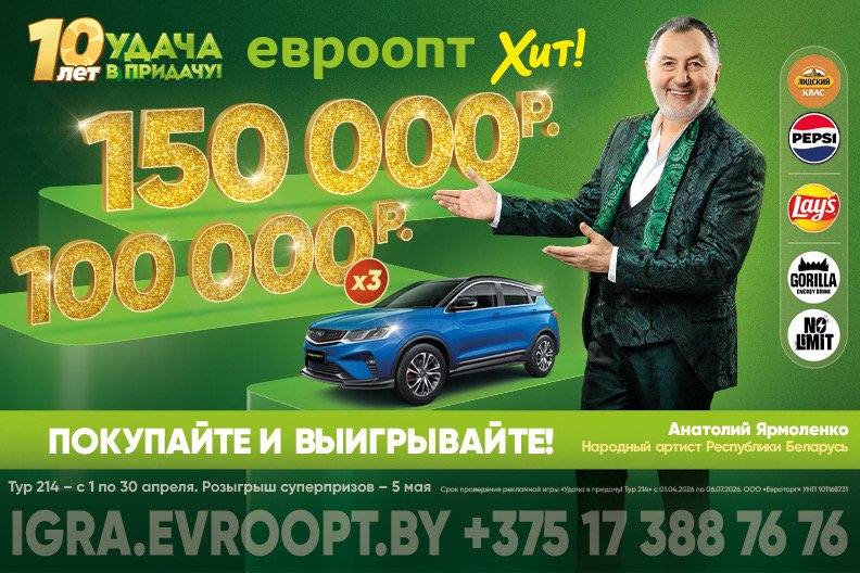 По 30 апреля любой покупатель магазинов «Евроопт» и «Хит!» может выиграть по-крупному. Включайтесь, время действовать!